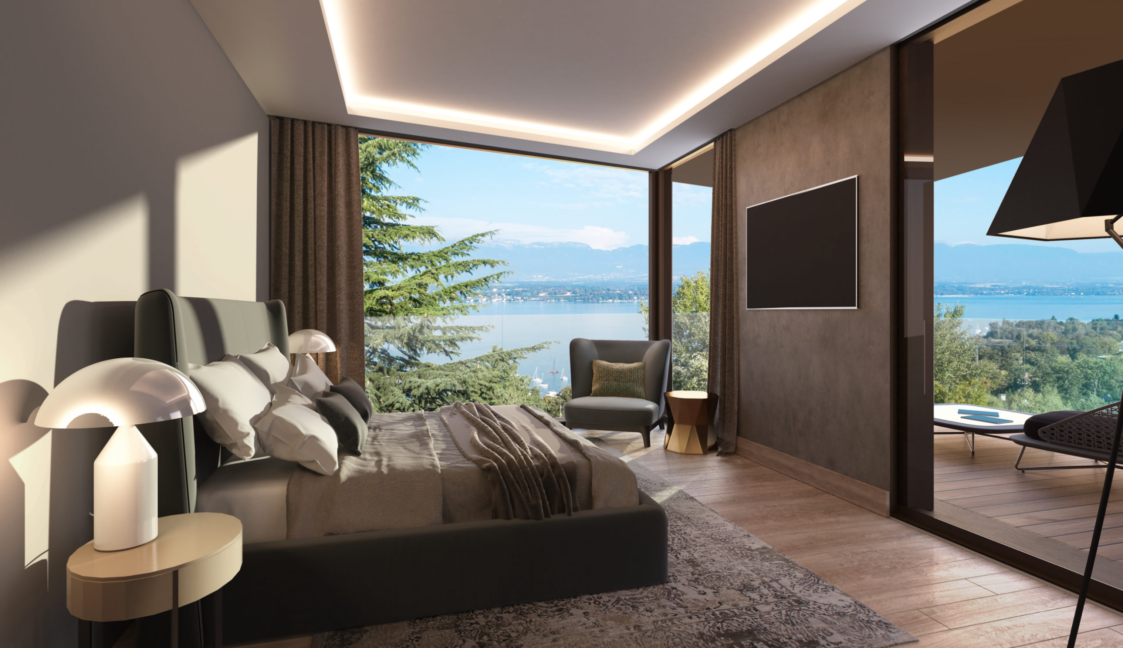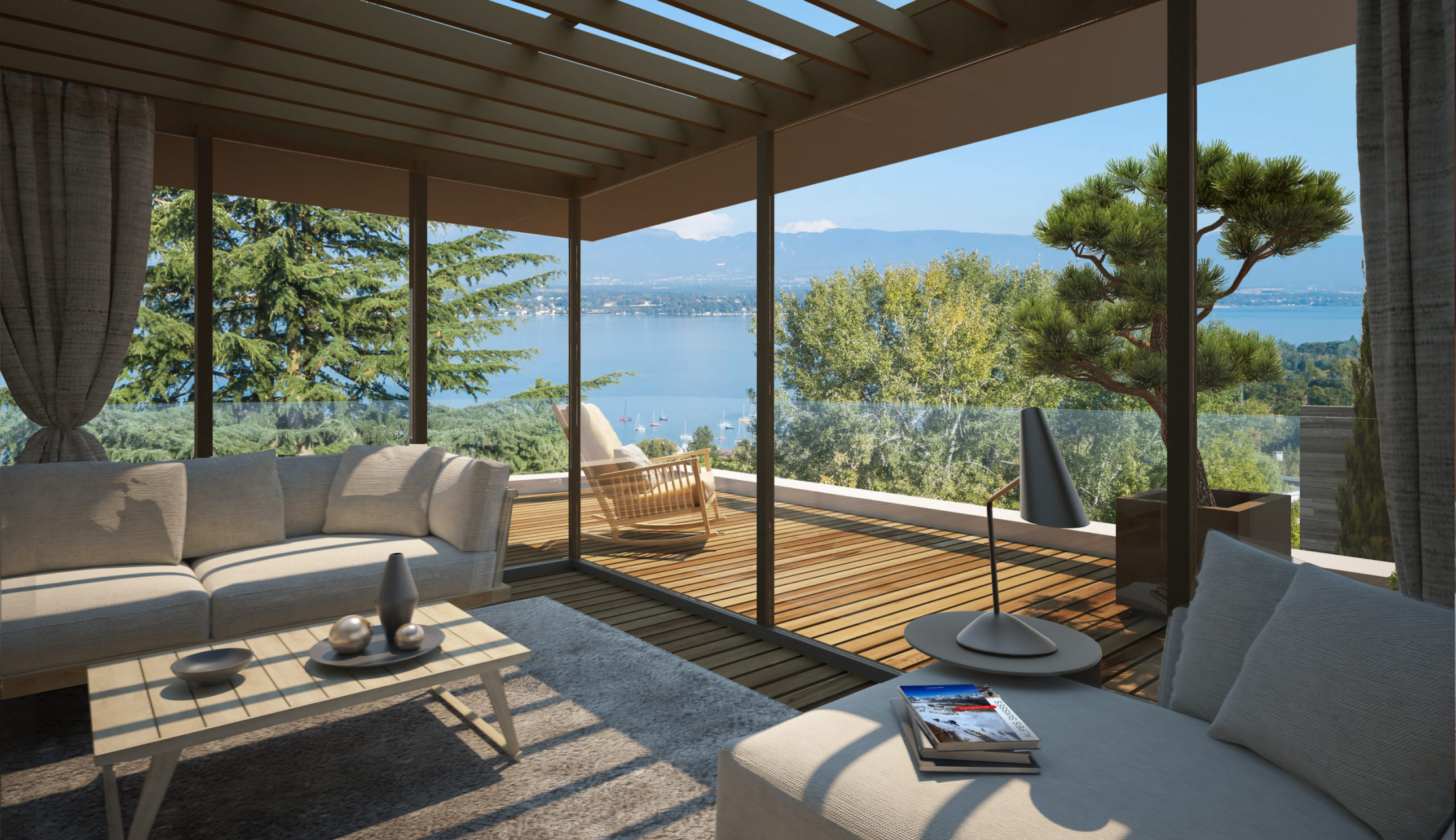 They feature bright, open spaces and spectacular views of Lake Geneva and the Jura Mountains, while also offering private gardens and infinity pools.