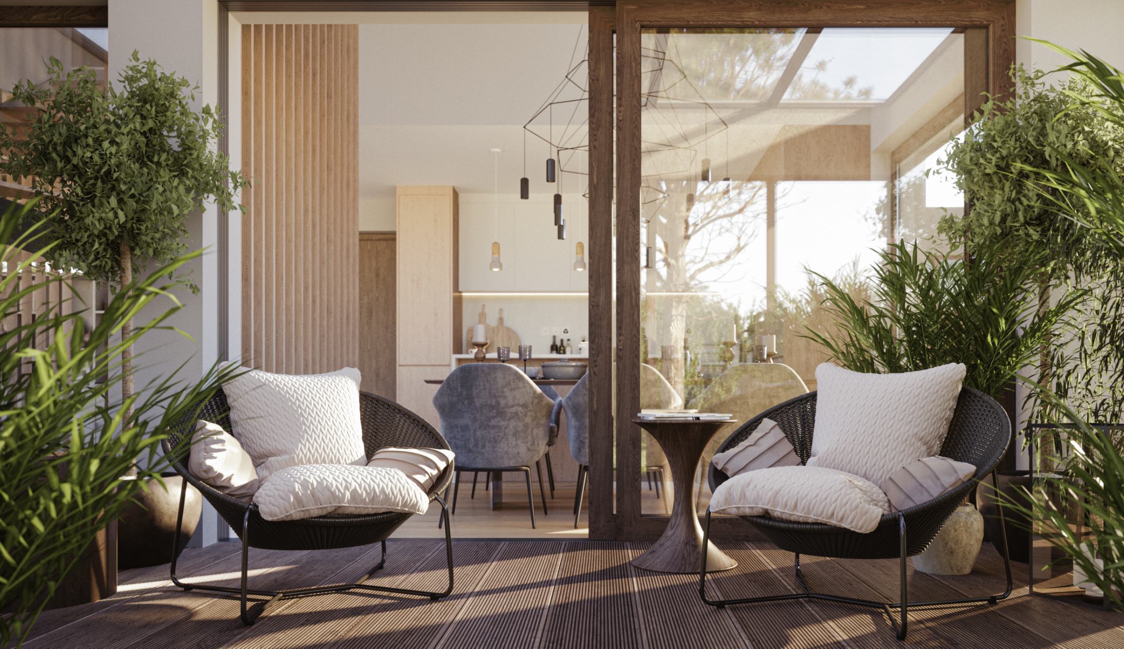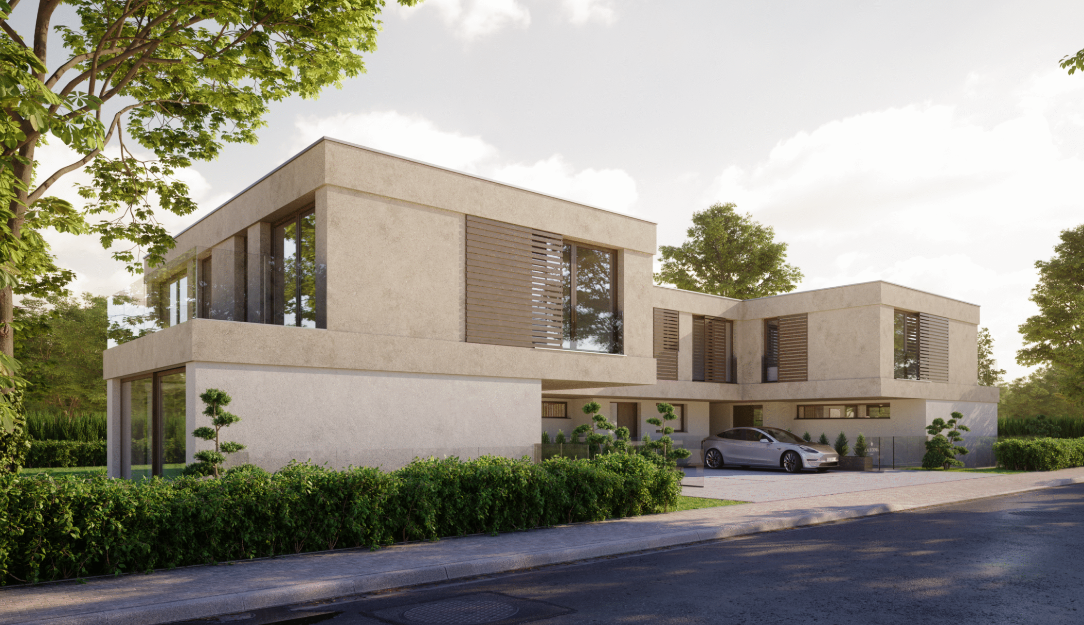 California consists of two semi-detached villas offering high-end amenities, designed in a contemporary architectural style.